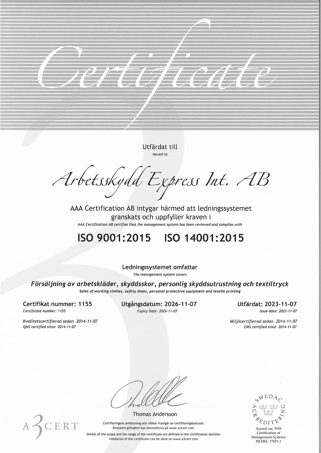 Vi stræber efter at opretholde de højeste standarder gennem vores transparente, strukturerede og aktive arbejdsmetodik for at opfylde kravene til vores ISO-certificeringer 9001 (kvalitet) og 14001 (miljø). Disse certificeringer udgør en garanti for vores kunder, som kan være trygge i visheden om, at vores tekstiler og stoffer er fri for skadelige kemikalier. Vi gennemfører regelmæssige og grundige tredjepartskontroller på vores fabrikker for at sikre, at vores produkter opretholder en høj og ensartet kvalitet. Denne dedikation til kvalitet og miljøansvar gennemsyrer hele vores virksomhed og udgør grundlaget for det tillid, vi stræber efter at opbygge med vores kunder.