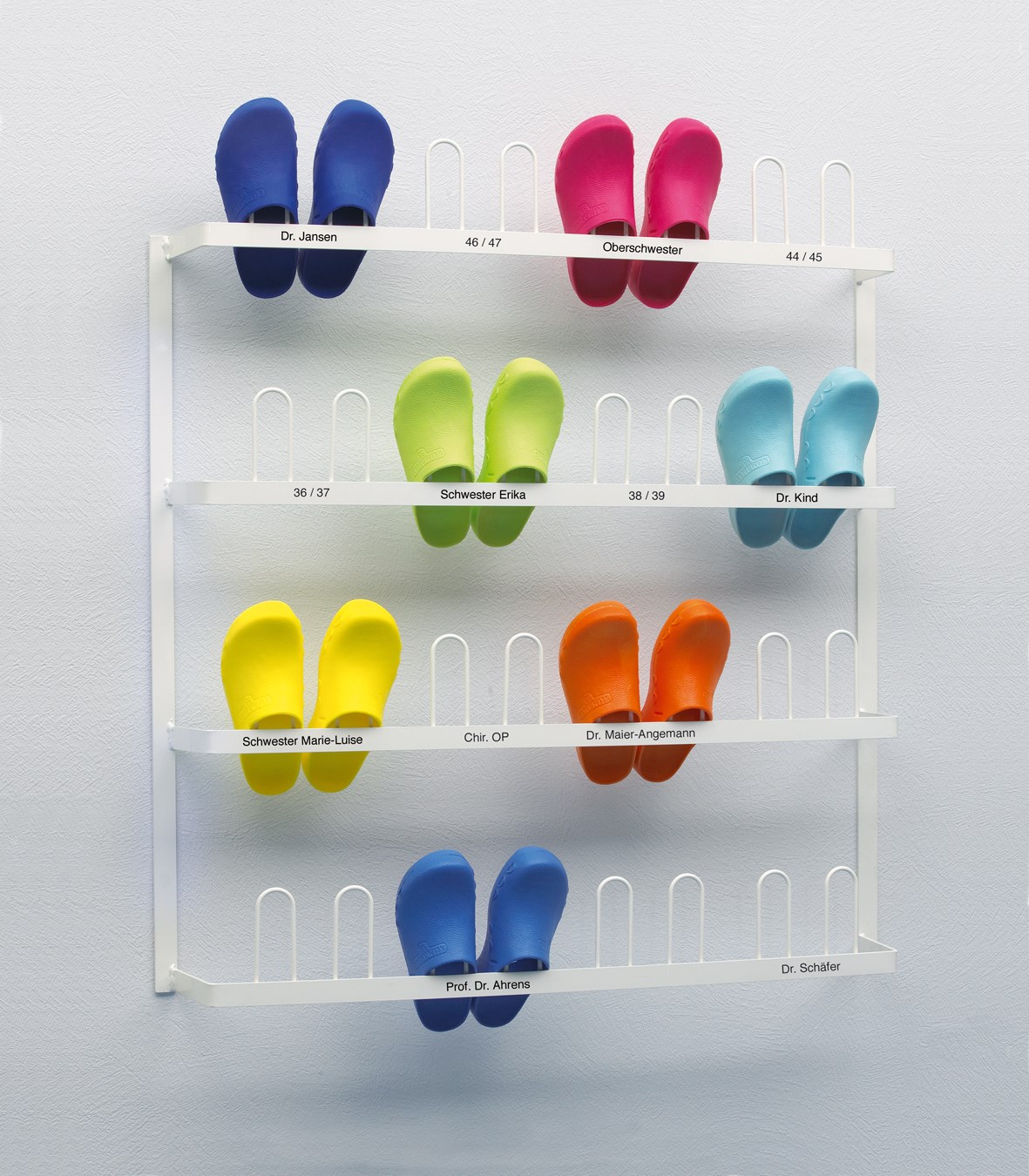 Vägghängd hylla i pulverlackerad stål med plats för 16 par KlimaFlex. Mått: H 1070 mm x B 950 mm (kan måttbeställas).