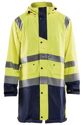 En riktigt funktionell regnjacka i varsel med huva. Uppknäppbar droppkant. Reflexer fram och bak samt på ärmar. Certifierad enligt EN 471/ EN ISO 20471, klass 3 skyddskläder med hög synbarhet och EN 343 klass 3,1 skyddskläder mot dåligt väder. 100% polyester, PU-belagd, vind- och vattentät, andasfunktion, 185g/m². 50 mm breda transferreflexer