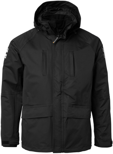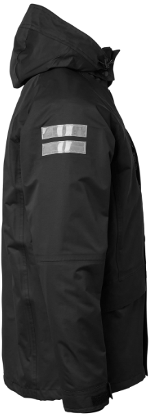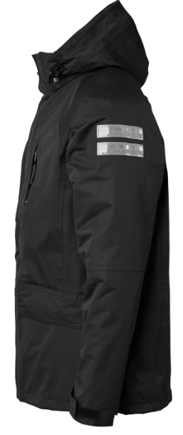 Avtagbar huva. Reflexdetaljer för bättre synlighet. Justerbara muddar. Två bröstfickor med dragkedja, två sidfickor med lock och dragkedja