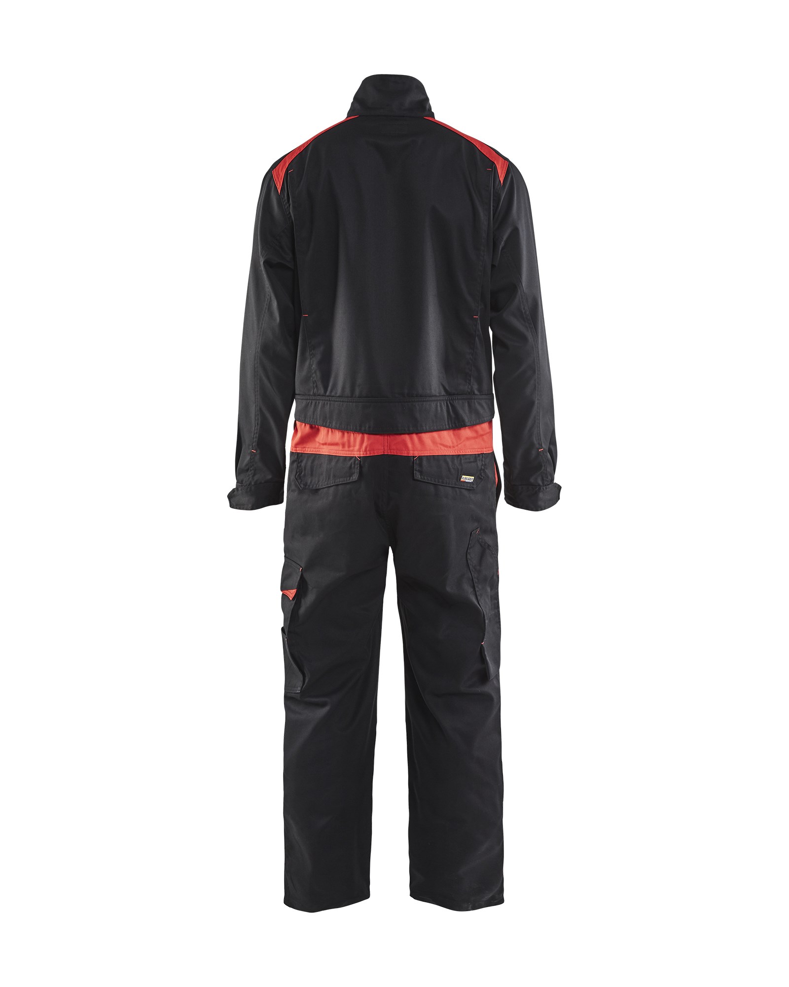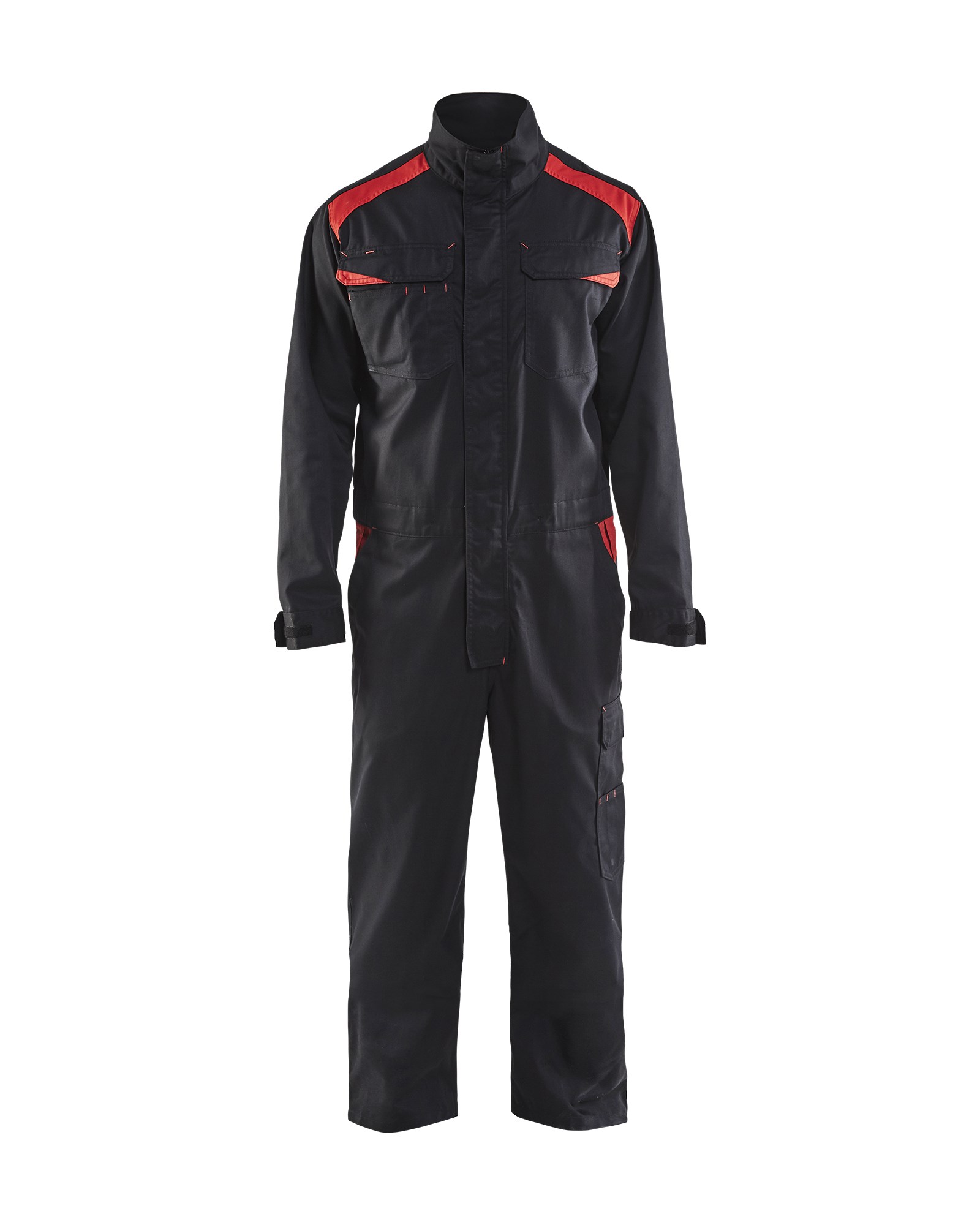 Blåkläder Overall Industri Overall med detaljer och tränsar i kontrastfärg, Två bälgade bröstfickor med lock, varav en med tvådelad pennficka, Två insticksfickor, Reglerbara ärmavslut, Frontslå med tryckknappar som döljer blixtlås, Bälgveck och stret