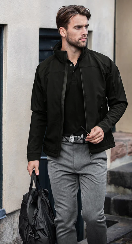 Duxbury Jacka Herr, en modern softshelljacka med perfekt passform. Den har eleganta dubbelstickningar, en unik dragkedja på överarmen och till hälften täckta sidfickor. Invändig mudd i ärmslut ger extra komfort. Men en gummerad vindklaff bakom dragke