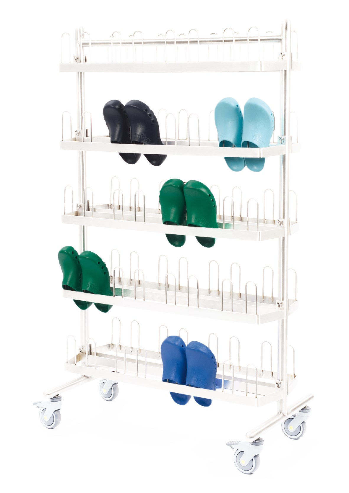 Rostfri vagn med dubbla hyllor, plats för upp till 40 par KlimaFlex skor.