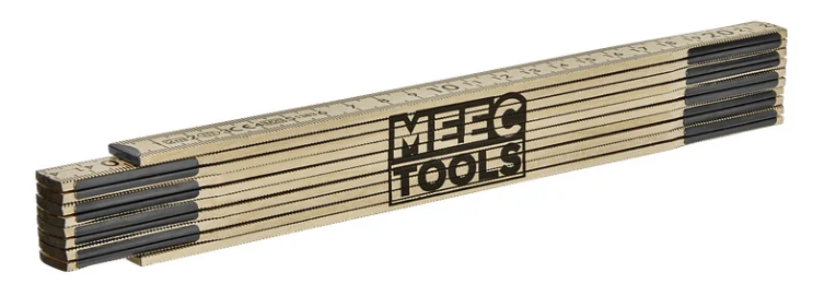 Wooden folding ruler with meter scale. Millimeter markings with color-coded decimeter intervals.
